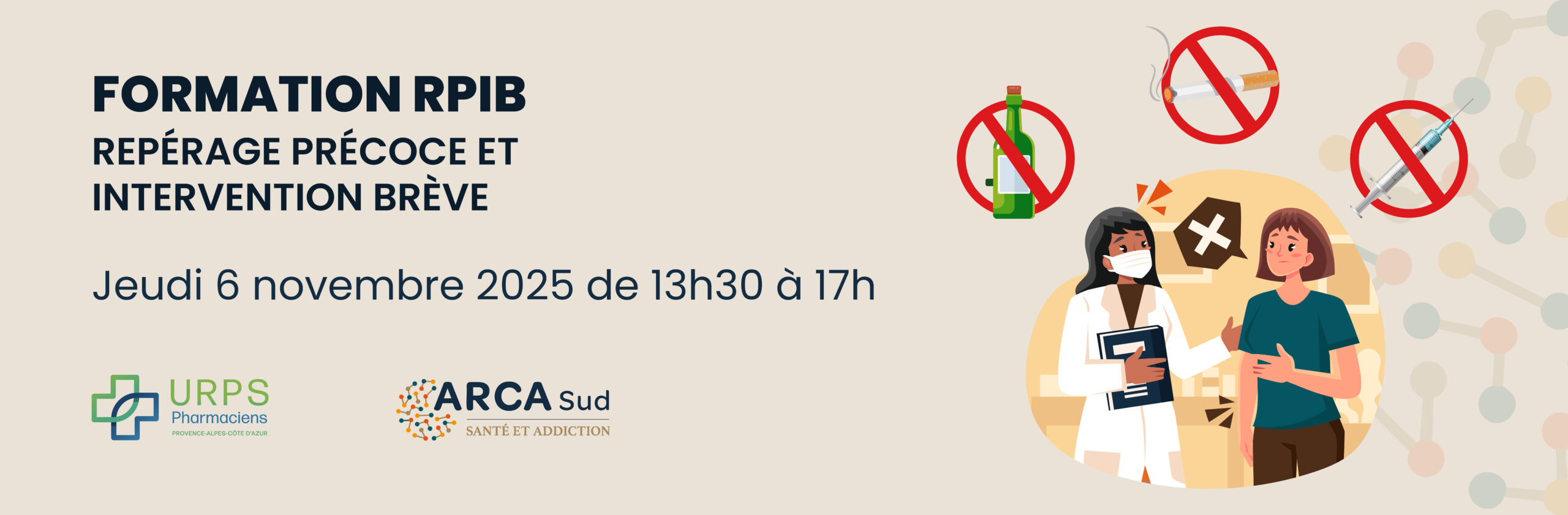 Professionnels de santé, participez à la formation RPIB (Repérage Précoce et Intervention Brève) organisée par ARCASUD et l’URPS Pharmaciens PACA en visioconférence le jeudi 6 novembre de 13h30 à 17h.